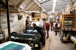 In 1968 the workshop moves to larger premises situated in Rue Vielle du Temple in the center of the Marais district. Again the old printing workshop succeeded to attract artists creating masterpieces on the old stone press. Just to mention Asger Jorn, Pierre Alechinsky, Antonio Saura, Bram Van Velde, Maurice Wyckaert, Pol Bury, Roland Topor, Tabuschi , Jan Voss, Antonio Segui, and many other well know international artists.